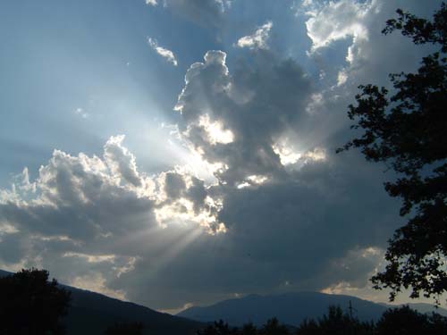Uitzicht vanuit het appartement, zon boven de Olympus