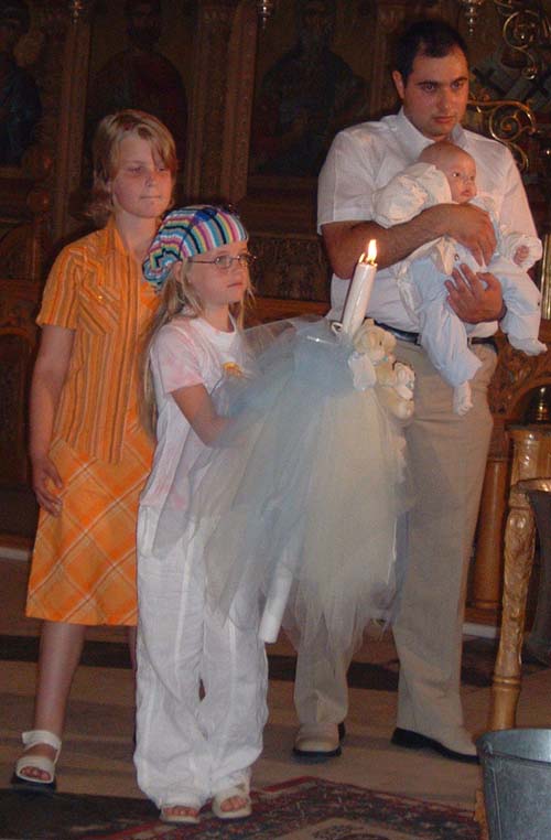 Doop ceremonie, Manos met Alkian, Yildez en Dagmar met de doopkaars